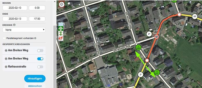 Muss eine Sperrung für mehrere Segmente eingetragen werden und es sind dabei sowohl 2-Way als auch 1-Way-Segmente betroffen, kann die Sperrung trotzdem für alle Segmente mit der Fahrtrichtungsauswahl “Zweibahnstraße” vorgenommen werden. Die nach dem Speichern angezeigte Fehlermeldung “Nur manche der Sperrungen wurden gespeichert” (mögliche Zusatzmeldungen “Cannot add road closure since segment forward direction is forbidden” und “Cannot add road closure since segment reverse direction is forbidden”) weist nur darauf hin, dass für die 1-Way-Segmente die Sperrung nur für die jeweilige Fahrtrichtung übernommen wurde, außerdem werden dann links auch mehrere Sperrungen aufgelistet, die dann teilweise noch den Hinweis “Diese Sperrungen gelten nur für manche der ausgewählten Segmente” haben. Trotzdem sollte nach dem Erscheinen dieser Fehlermeldung genau kontrolliert werden, ob der Eintrag der Sperrung wie gewünscht erfolgte.