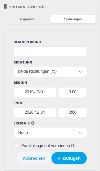 Zum Aufruf einer bereits eingetragenen Sperrung wird das betroffene Segment zuerst markiert (mehrere mit gedrückter STRG-Taste) und dann auf den Tab “Sperrungen” geklickt, dort werden alle für das Segment eingetragenen Sperrungen aufgelistet. Beim Anklicken einer Sperrung wird diese zum Bearbeiten geöffnet.