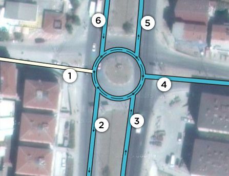 Always ask yourself, what kind of instruction will you hear or see in the app? Do that for every road into every direction. In the picture, if you are at segment 3, and want to go to segment 5, you would now get “On the roundabout, take the 2nd exit”. That is not conform the actual situation for the driver, who just drives straight. In this case, a roundabout would thus yield confusing instructions.