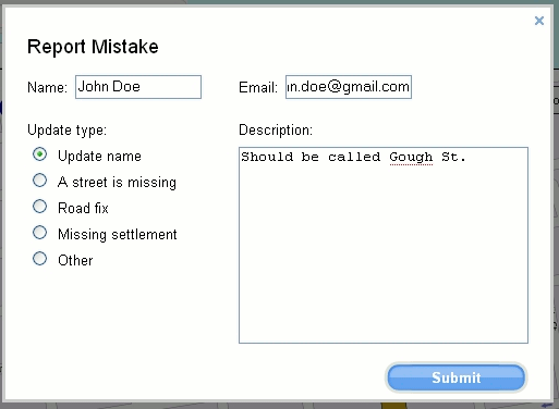 - Click the link to get an overlay layer displaying a fill-in form where you can choose the type of mistake and suggest a correction. Give your name and email (anonymous corrections aren’t accepted) and click Submit.