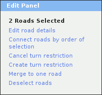 Selecting two road segments displays (first one using regular left click, second one using +left click), in the Edit panel, a list of changes you can make to the relationship between them: