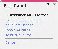 - Choose “Cancel turn restriction” to remove an indication that currently appears, forbidding turns from the first road selected into the second.
