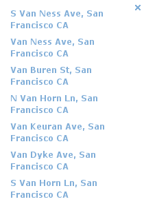 - Enter the name of the street and city – for instance, Van Ness, San Francisco.