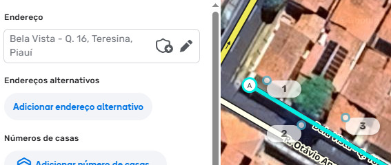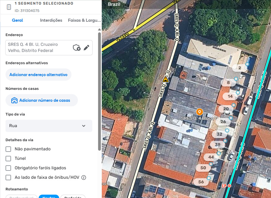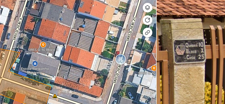 Na imagem abaixo, o cursor está sobre o segmento do Bloco Z1, mas apontando para os fundos do Bloco X. Como se vê na foto da fachada, a casa corretamente tem a identificação do Bloco X. Porém, no Waze, o seu endereço só pode ser associado ao Bloco Z1. Por isso, não dá pra botar o número da casa.