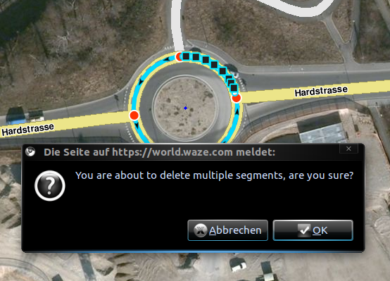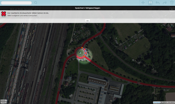 - Du kannst nur alle Segmente des Kreisverkehrs löschen damit Du speichern kannst. Ansonsten erscheint diese Fehlermeldung: