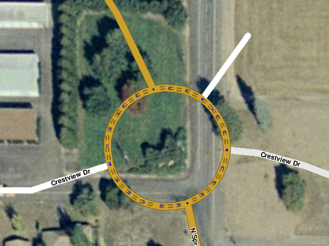 Bearbeite alle Kreuzungen des Kreisverkehrs mit “Q” und “W”, um die Abbiegungen Hard zu machen. Lies dazu die Seite: Soft und Hard Turns