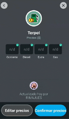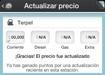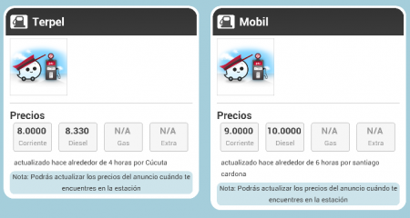 La función de actualizar los precios de las estaciones de servicio (Gasolineras) ha sido activada en Colombia desde el 23 de Enero de 2013, Se pueden ingresar los 4 tipos de combustible que podemos encontrar en el país: Corriente, diesel, gas y extra.