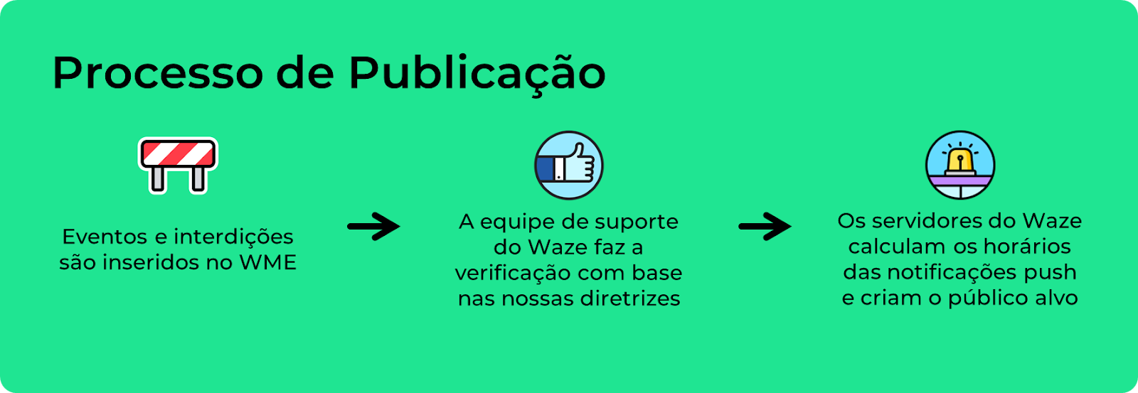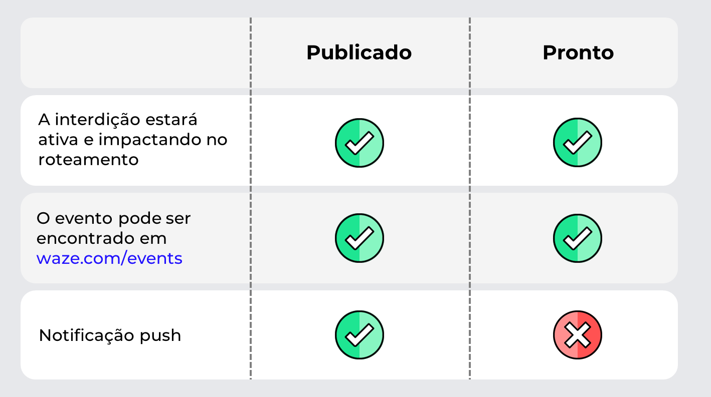 Dica: Se precisar que um evento fora do padrão envie notificação push mesmo assim, entre em contato pelo e-mail: waze-closures@google.com