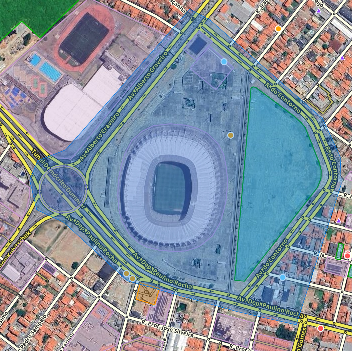 - Evento baseado em polígono + interdição: Uma festa de rua próxima a um local de eventos, onde há vias bloqueadas e também congestionamento nas redondezas.