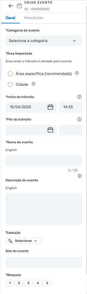 - Adicionar informações do evento: Informe o horário de início e fim do impacto no trânsito, o nome do evento, traduções (se necessário) e o nível de bloqueio (lock level).