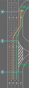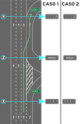 A diferença é que como podem ver no ponto inicial tem três faixas que seguem em frente mas somente duas estarão disponíveis para a conversão distante, então se ele usar a faixa mais a direita no primeiro ponto, quando chegar ao segundo ele estará na faixa errada.
