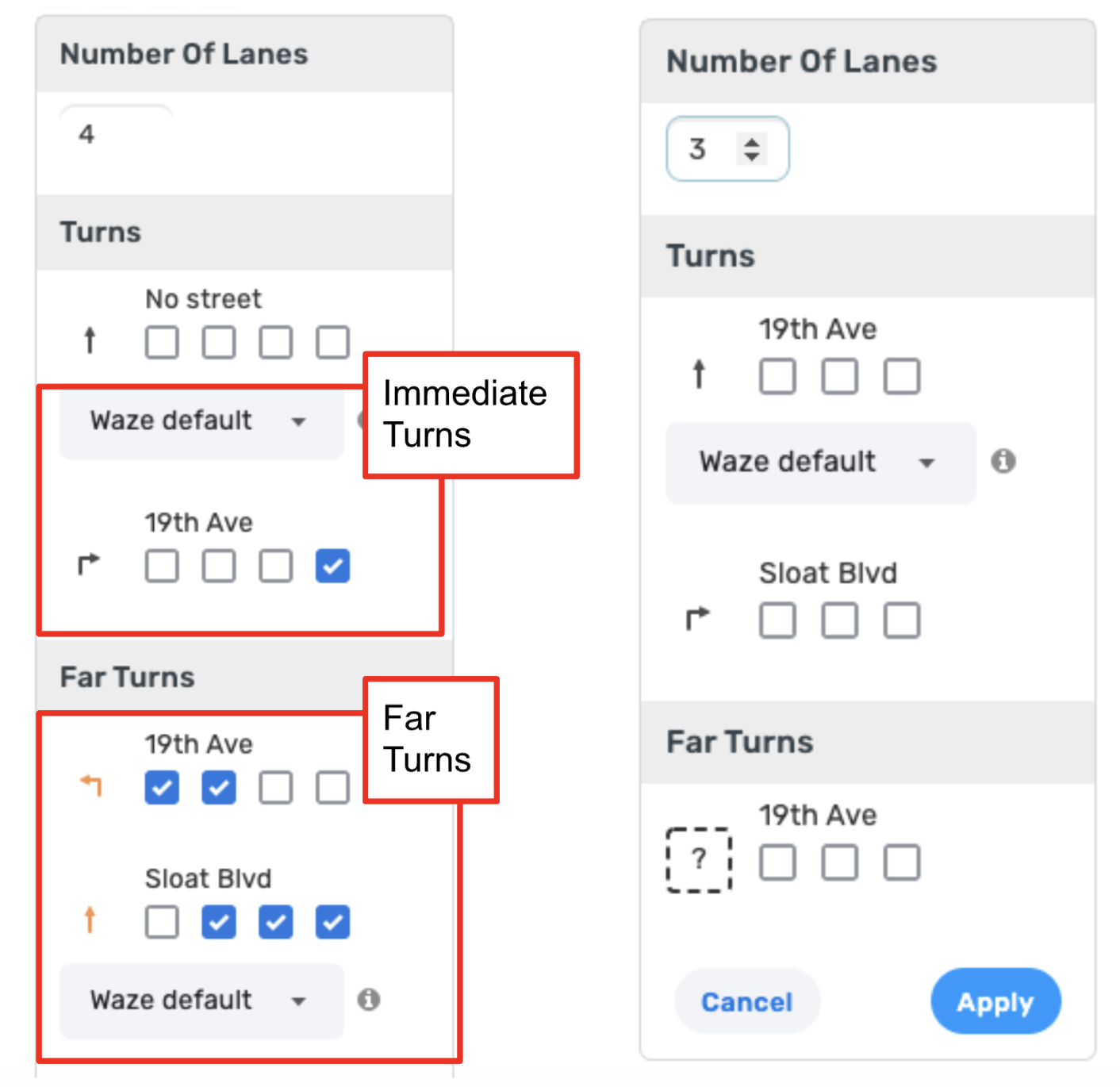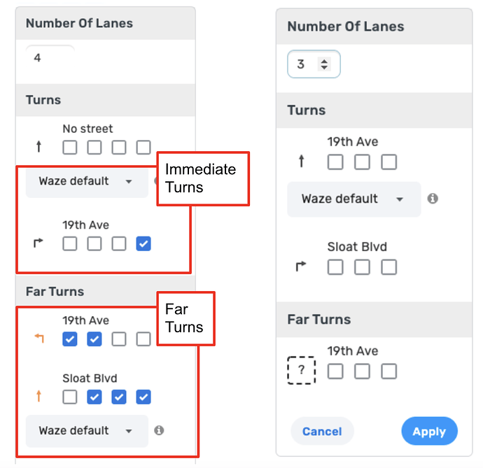 - Far Lanes - All immediate turns have lanes OR if an immediate turn doesn’t have lanes, all the far turns that go through this turn must have lanes.