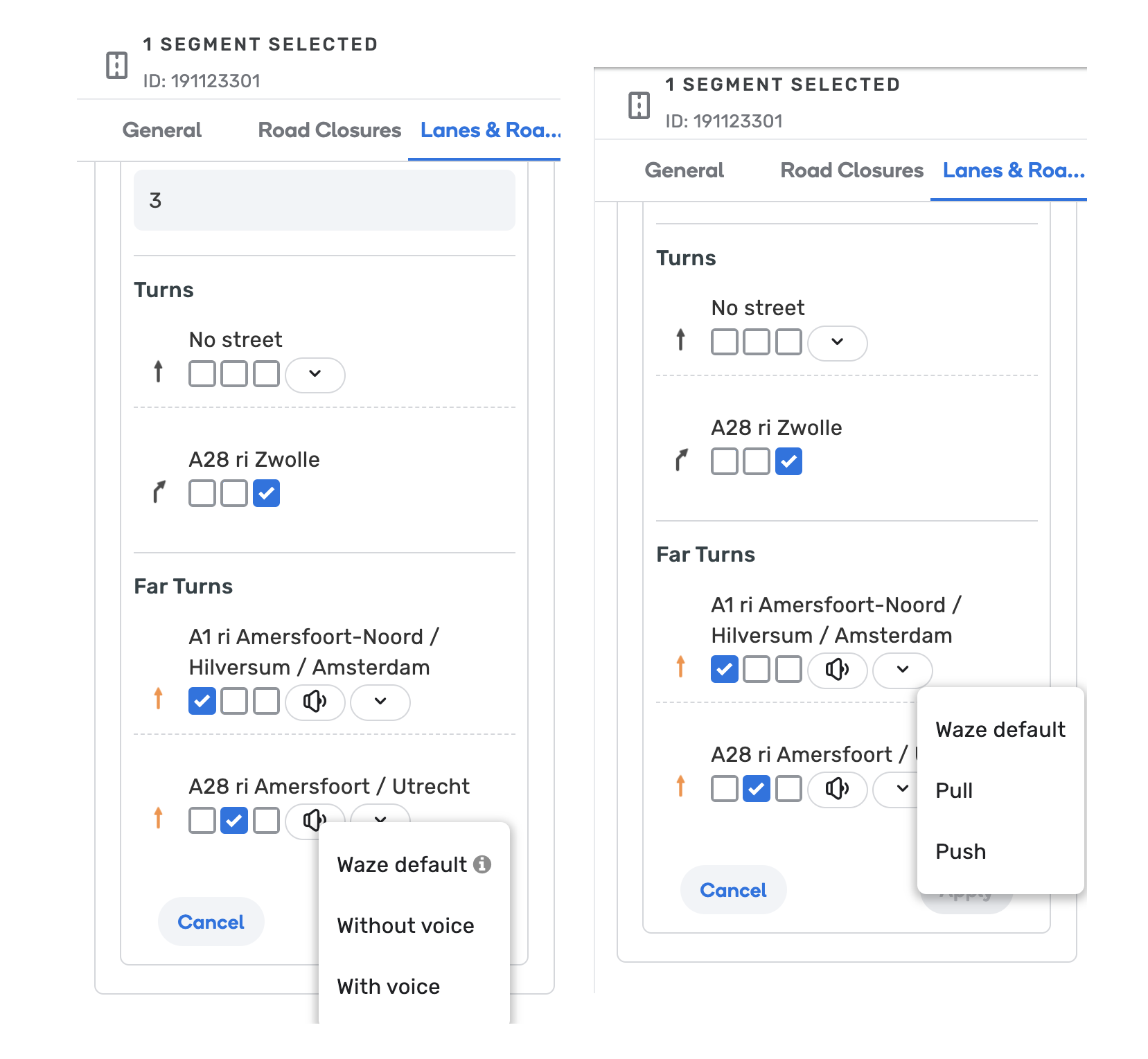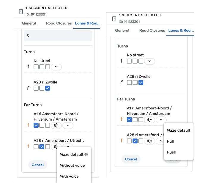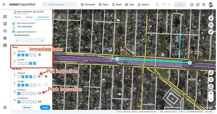 - “Push” - means we want to set the instruction to the first instruction point in the path (the first “inner” turn of the far turn) - When pushing - the entire turn instruction on the first turn is being replaced with whatever is defined on the entry segment, unlike the “automatic push” (see “Waze Default”) that occurs for short (>50m) segments, if you choose to push, this will override the instructions even if there are instructions defined on the turn.