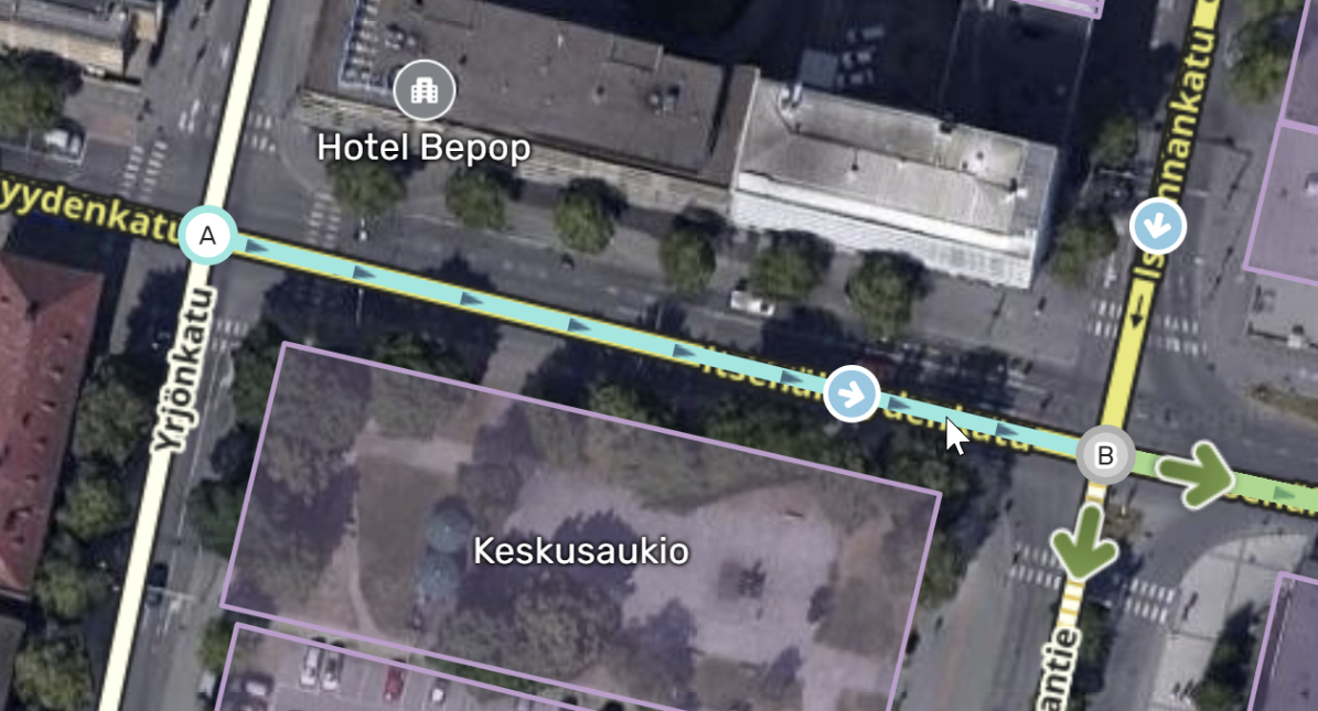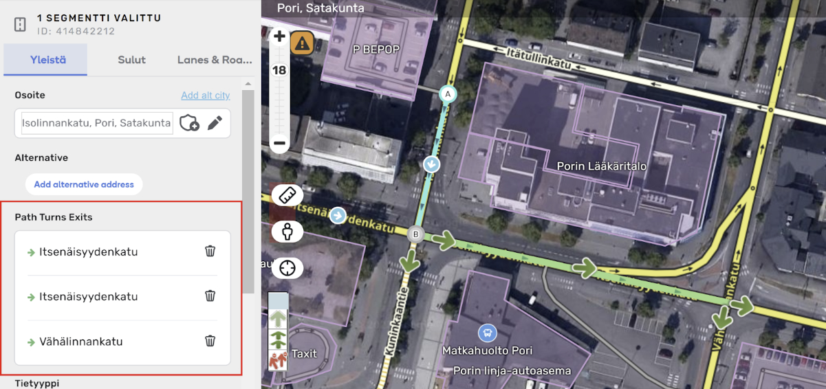Napauta sitä ja WME luo sinulle polun. Sen merkiksi aloitussegmenttiin ilmestyy polkua kuvaava ikoni (kuvassa oleva nuoli-ikoni keskellä aloitussegmenttiä). Huomaa, että ikoni tulee näkyville vain, jos ajaminen aloitussegmentiltä ulostulosegmentille on mahdollista. Kääntymisten ja ajosuuntien tulee siis olla oikein määritelty, jotta käyttäjä voi ajaa polkua pitkin.