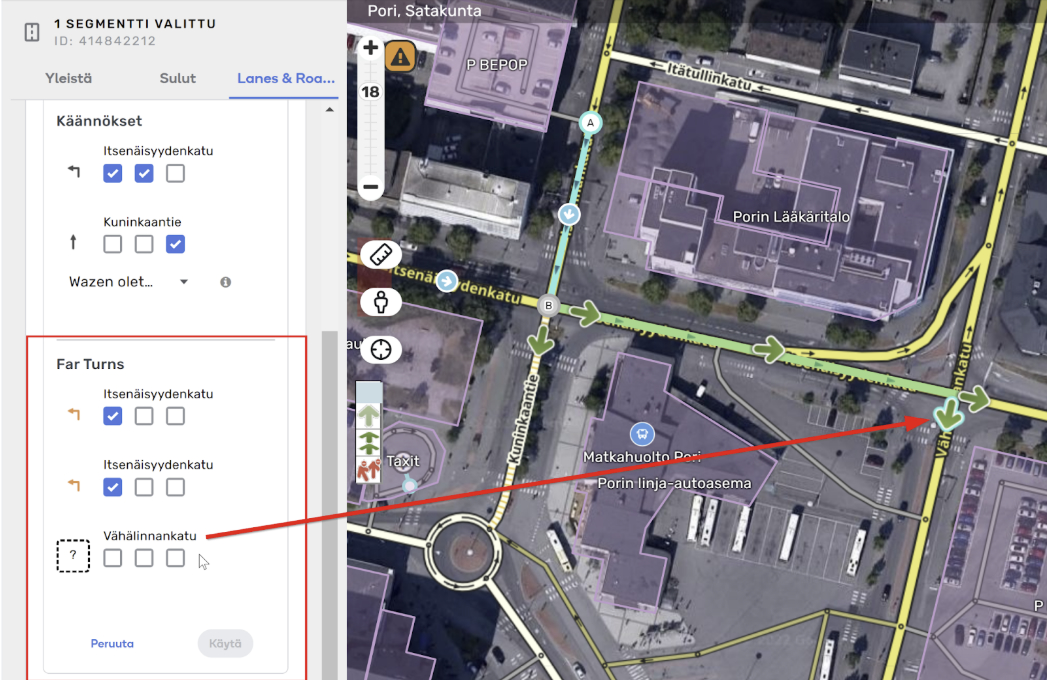 Huomaa, että segmentille on tässä esimerkissä jo aikaisemmin määritetty kaistat, jotka käyttäjälle näytetään seuraavassa risteyksessä. Tässä tapauksessa tahtoisimme, että käyttäjä valitsisi jo täällä vasemmalle kääntyvistä kaistoista oikeanpuoleisen, jotta oltaisiin jo ajoissa oikealla kaistalla viimeistä käännöstä varten. Kaistaopastusta on nyt laajennettu Far turns-toiminnolla, joka näyttää seuraavalta: