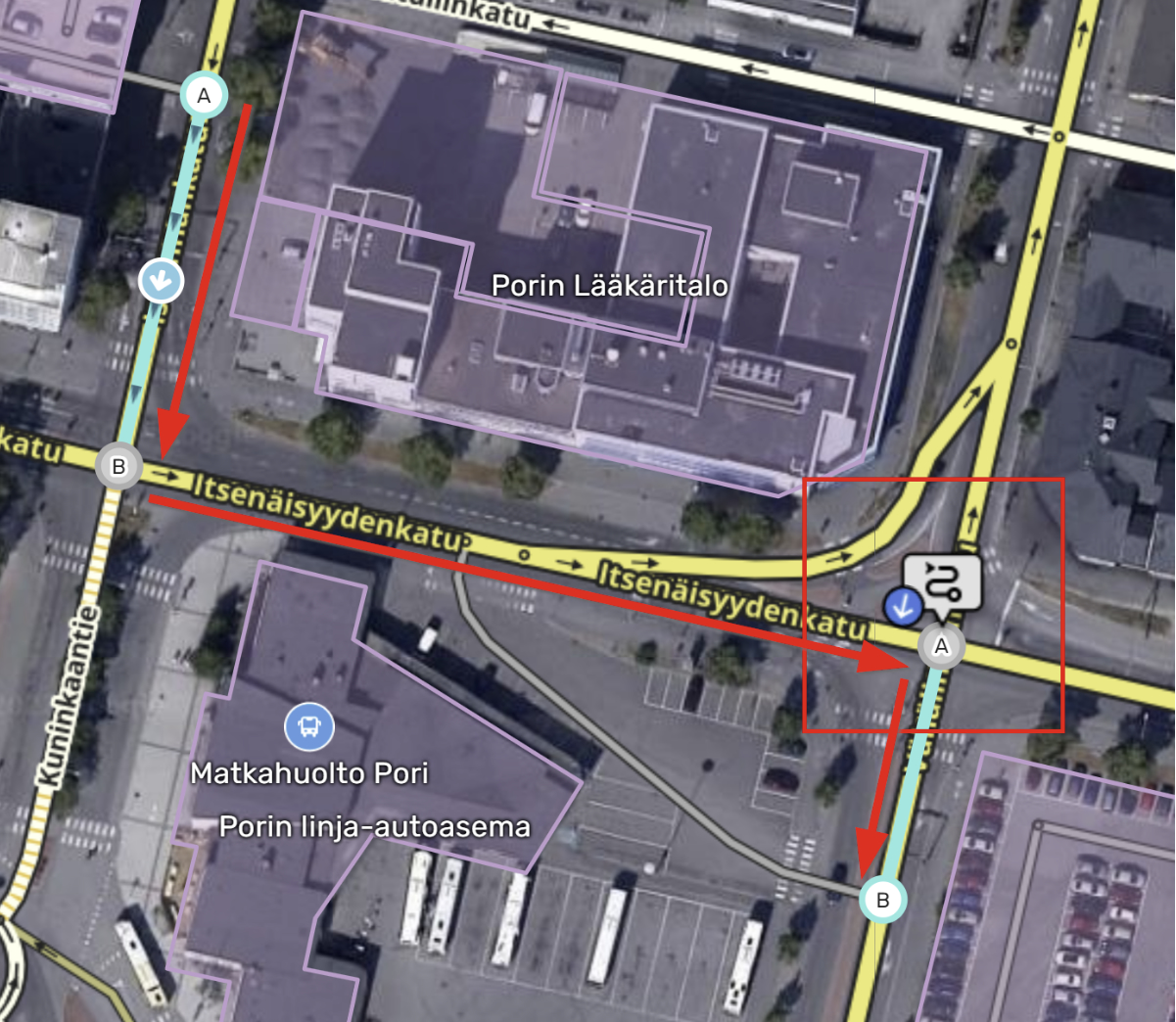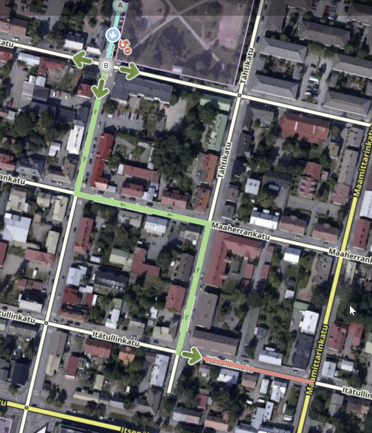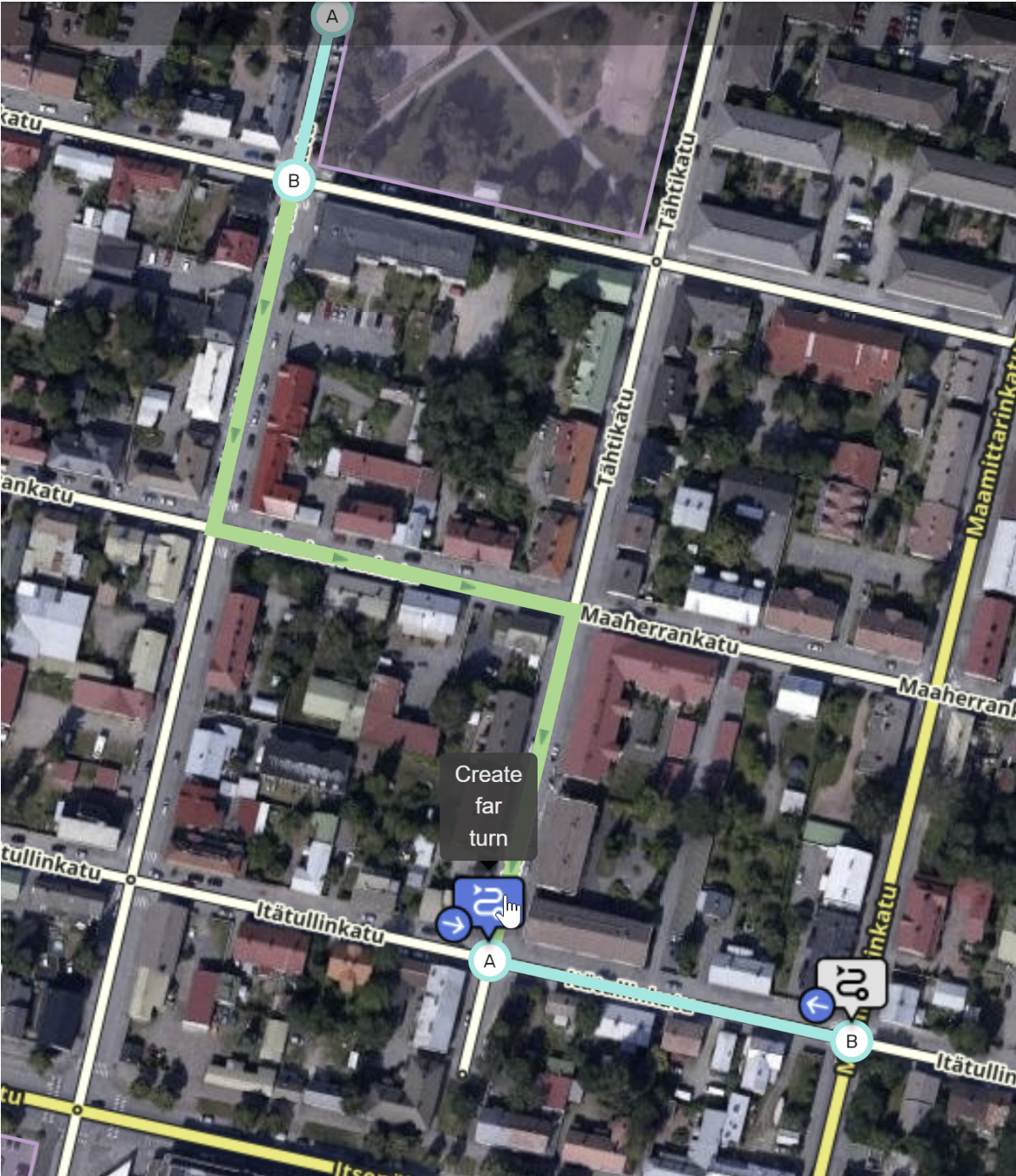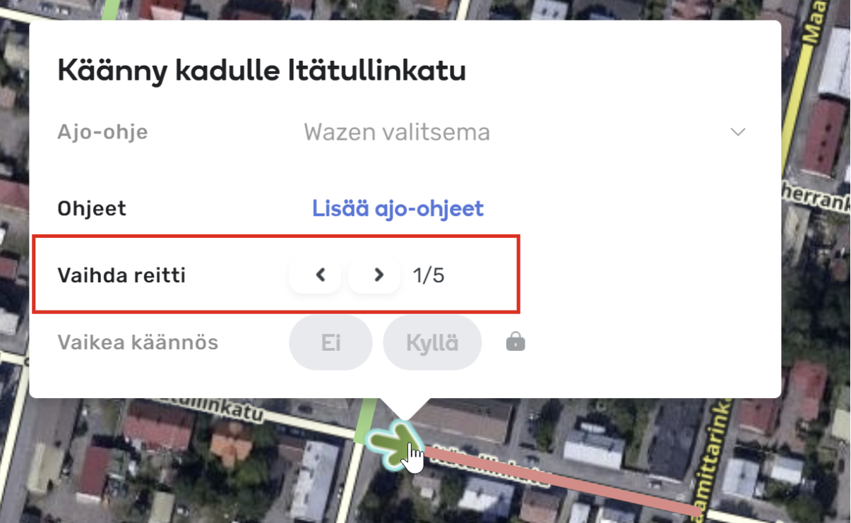 Voit siis valita, mitä reittiä Waze opastaa käyttäjän ulostulosegmentille (kts. myös Tunnetut rajoitteet). Teoriassa siis alla olevaan kuvaan vihreällä merkitty reitti on mahdollinen, mutta ei toki järkevä.