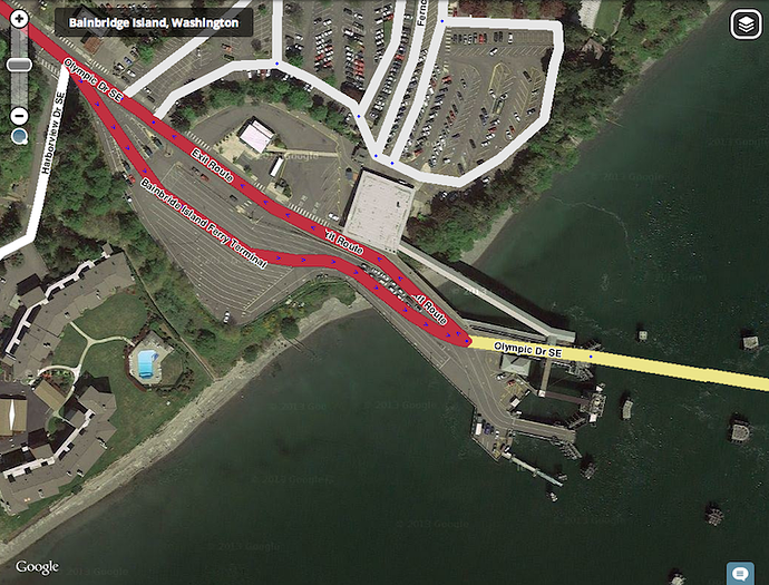 Turn on the GPS Points Layer to see the ferry’s typical path. If no GPS point are visible, it may be OK to simply draw a straight line between the two docks.