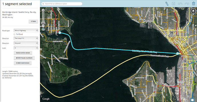 Draw another one-way segment connecting the main roads to the loading ramp segment on both sides using the same road type as the ferry. Mark is as a toll road if it has a fee in the direction of this segment. It should be labeled with correct city name on each side and “to Bainbridge Island - Seattle Ferry”. (Editor Note: some ferries charge riders going one direction and not the other. You commonly see this when ferries are going to an Island where the ferry is the only access, then the ferry going to the island is toll road and ferry going to main land is not tolled. Splitting exit and entrance ramps enable this flexibility).