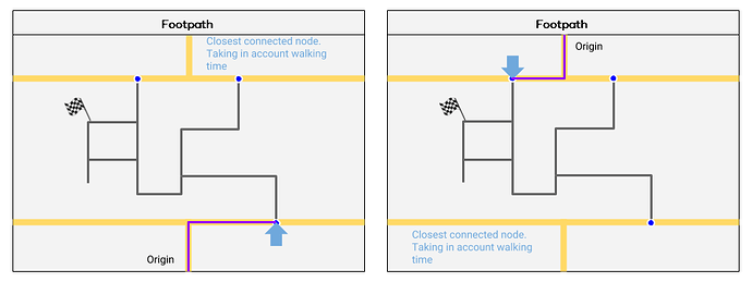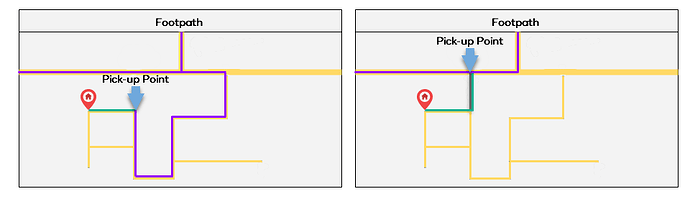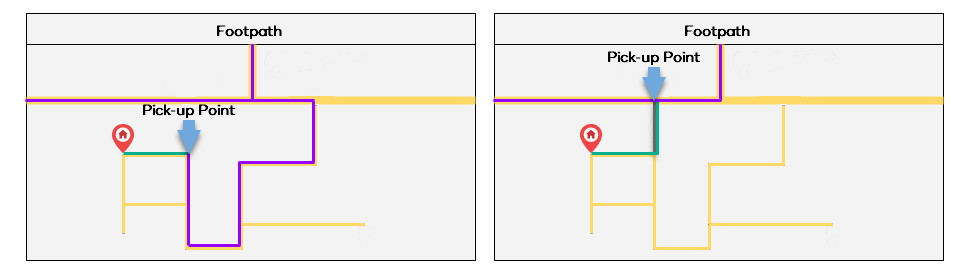 In this example, without the footpath (grey), the driver (purple) must drive much further, when instead the rider (green) could take a short walk to a more convenient pickup point if the footpath is mapped.