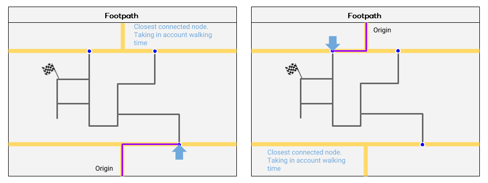 If a footpath is closest to a destination or starting point, users will be routed to/from where the footpath connects with a drivable road. They are helpful in getting the user to/from a place that is far from a routable segment. For example, a business that is only accessible on foot and commencing the walk from a specific routable road is required; connecting carparks for a place that are physically separated, such as by a train line.