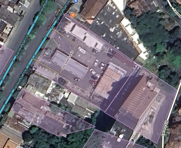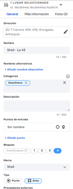 El punto de interés deberá marcarse del tipo “Gasolinera”; para que esta pueda ser visualizada en el aplicativo, las dimensiones son importantes, por tanto, debe tener un largo mínimo de 50m por alguno de sus lados. Es importante tener en cuenta que en las Estaciones de Servicio donde también se ofrezca el servicio de Gas Natural vehicular GNV solo se creara un place tipo área, y en la descripción podemos incluir la marca de la estación que ofrece este servicio, por ningún motivo crearemos las Estaciones de Servicio de manera individual.