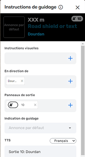 - Le contenu des champs “texte libre” doit respecter les conventions de nommage en vigueur (ne pas tout mettre en majuscule & ne pas ajouter d’espace après le trait d’union). Si une direction comporte un trait d’union, il faut corriger l’énonciation dans la case TTS[2:1] et non dans l’affichage.