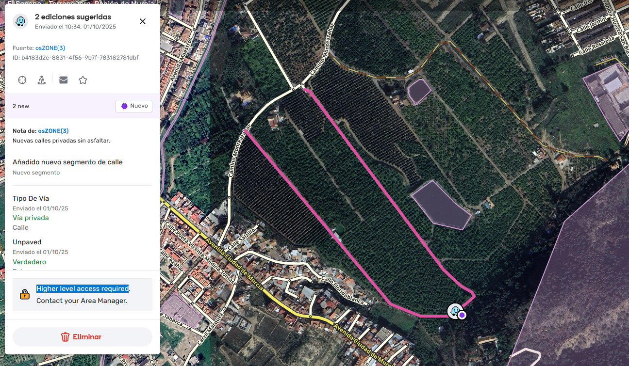 Esta mañana, haciendo una edición básica y sencilla (añadir una nueva calle privada sin pavimentar), dentro de mis zonas de edición, me ha salido el requerimiento de revisión:
