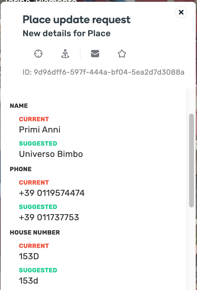 A user opens a Place Update Request on a place, updating the street name and leaving the other place details as they are. Note that the place already had a house number.