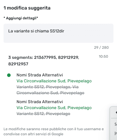 Hi, I just attempted to send a new suggestion on three segments, renaming the AN from Variante SS12 to ss12dir. The suggestion preview shows the removal of the wrong name, but not the addition of the new one