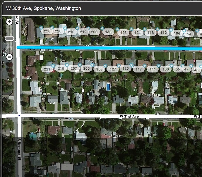 On road segments where Waze house numbers exist, Waze will approximate the position of ‘missing’ House Numbers. In the example image shown to the right, the end unit townhomes have the Waze house numbers marked, Waze will therefore approximate the location of the unmarked house numbers, roughly shown in blue.