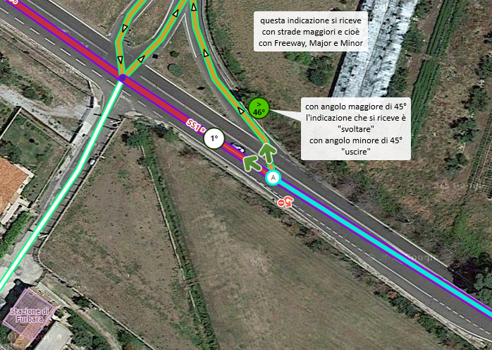 in questo caso le indicazioni date come da descrizione foto se la SS1 fosse una strada di livello minore a quelle descritte nella foto, le indicazioni svoltare con angolo maggiore di 45º (come da foto) ma se l’angolo fosse minore di 45º si avrà l’indicazione “tenere” e non “uscire”