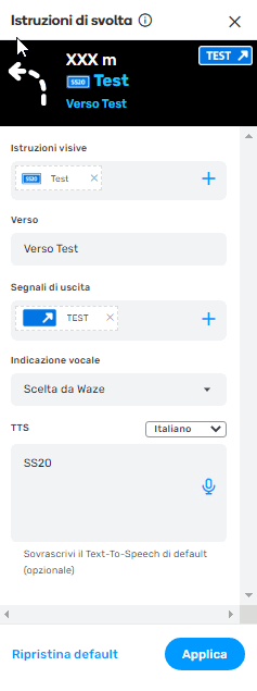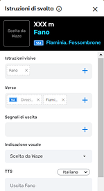 - Aprendo le “istruzioni di svolta” il campo “TTS” sarà pre-compilato uguale al PN del segmento immediatamente successivo alla svolta che si sta modificando, e sarà pronunciato come tale dalla voce guida di Waze, ma se in questo campo, per particolari necessità, venissero effettuate delle modifiche tale testo sarà quello pronunciato dalla voce delle istruzioni di guida, a discapito di quanto scritto in PN.