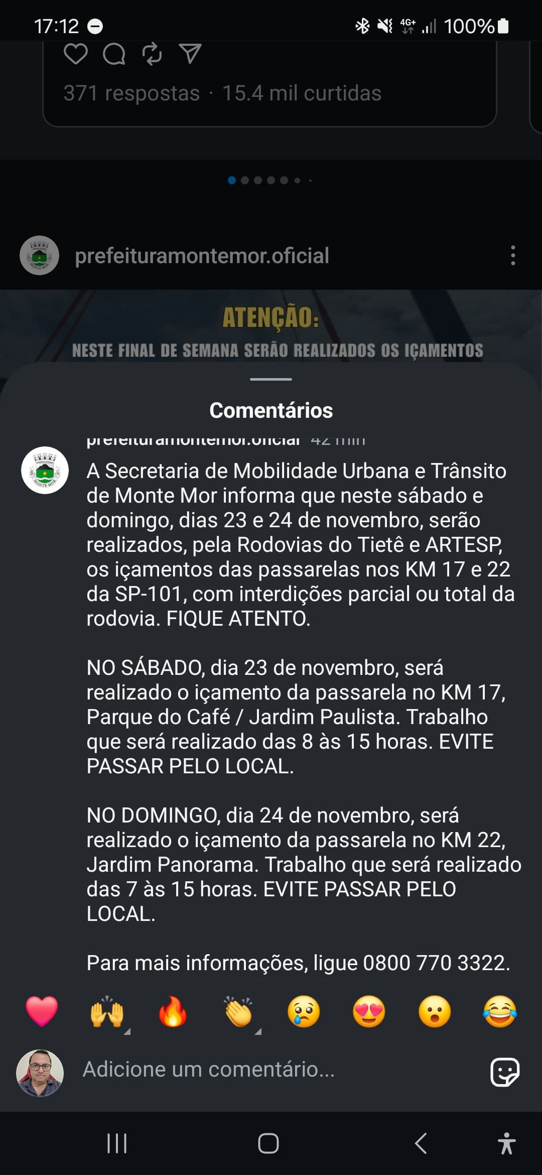 Boa tarde, podem colocar essa interdição Km 17 sábado dia 23 das 8 às 15 e domingo dia 24 km 22 das 7 às 15?