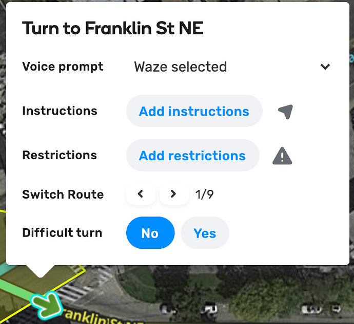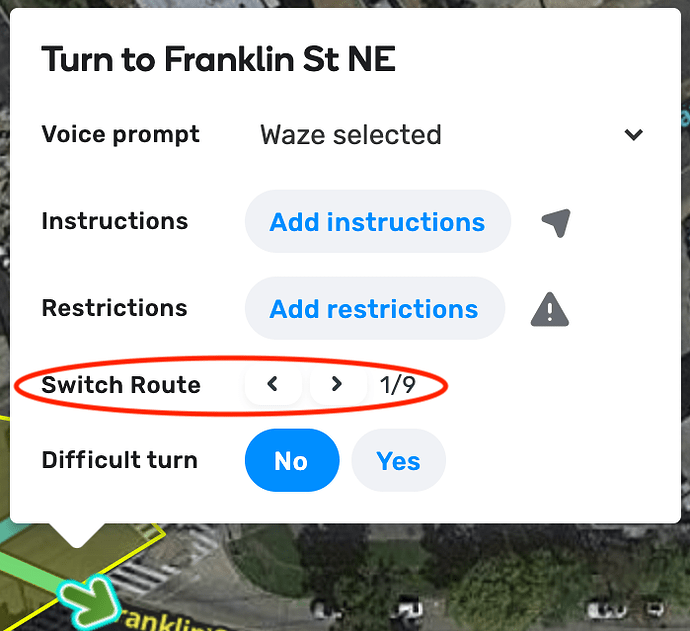 - The switch route selection will appear between the restrictions and difficult turn options in the turn arrow tooltip box.
