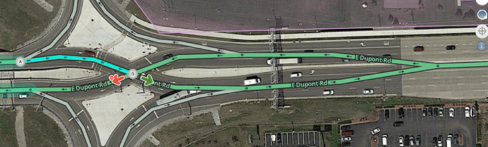 As with all at-grade intersections in Waze, all DDI at-grade intersections are modeled with junction nodes, including the two signaled intersections where opposing directions of traffic “cross over” each other (inner surface road junctions). A DDI may also have two outer surface road junctions, where the one-way segments transition to two-way road segments.