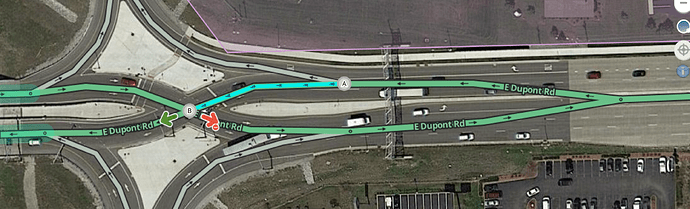 Because of name inheritance, the shortness of the stub, and the combination of turn instruction overrides, the name of the stub will be used in instructions at the exit, and the name of the ramp past the stub will be used at the ramp fork. This method should only be used when it’s not possible to replicate what drivers see on guide signs using simple naming or name inheritance.