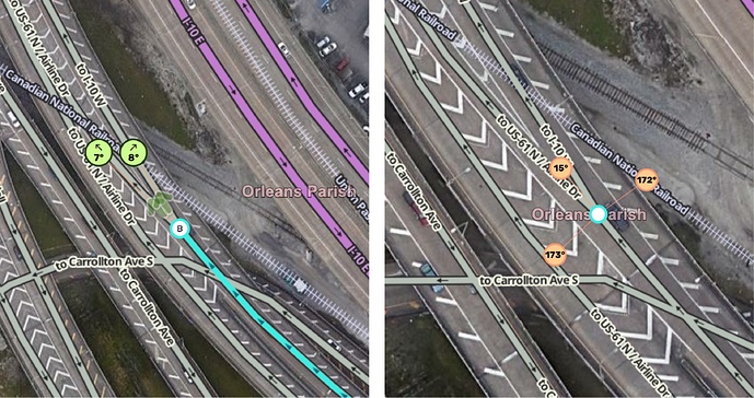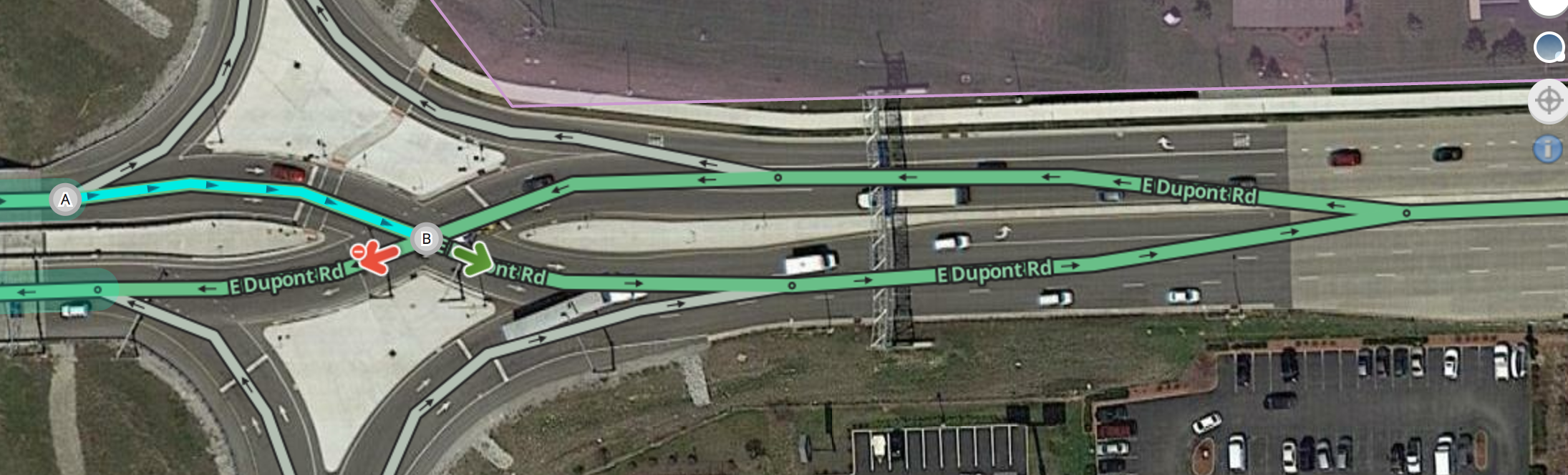 - If the actual path of the exit diverges from the inbound path by less than 20°, adjust the node to create a 20° departure angle. This will allow for consistent timing of exit instructions and make it easier to report closures in the Waze client.