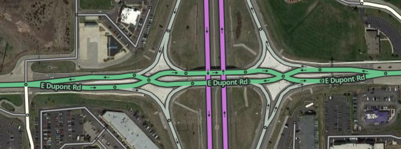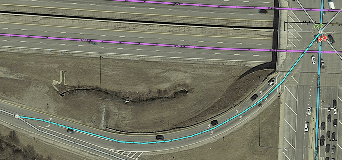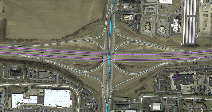 ’Like with a basic diamond interchange, often it will be necessary to represent the ramps making multiple connections to the surface street. Be sure to read the Simple is better section in the Junction Style Guide.