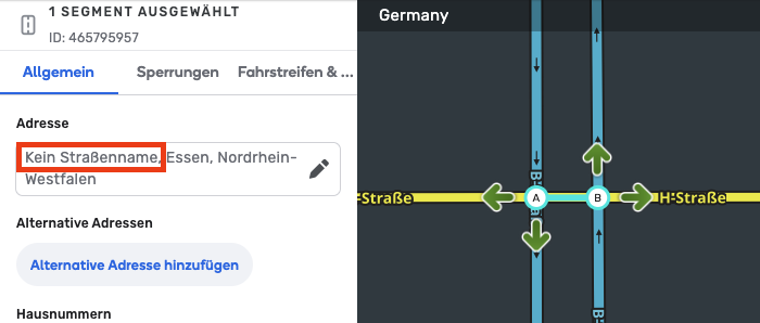Bei Straßensegmenten die innerhalb einer Kreuzung verlaufen, bleibt der Straßenname leer. Das Benennen dieser Felder führt zu falschen Ansagen für Abbieger. Das Segment darf nur benannt werden, wenn eine falsche Ansage für alle Abbiegerichtungen ausgeschlossen werden kann, auch für erlaubte U-Turns. Im Zweifel ist das Segment nicht zu benennen.
