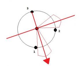 Pre zistenie správneho uhla pripojenia z pohľadu príjazdového uzla si znázorníme kruhový objazd na ktorom vynesieme priamku, ktorá prechádza stredom kruhového objazdu a vstupným bodom. Druhá priamka je kolmá na prvú a pretína ju v strede kruhového objazdu.