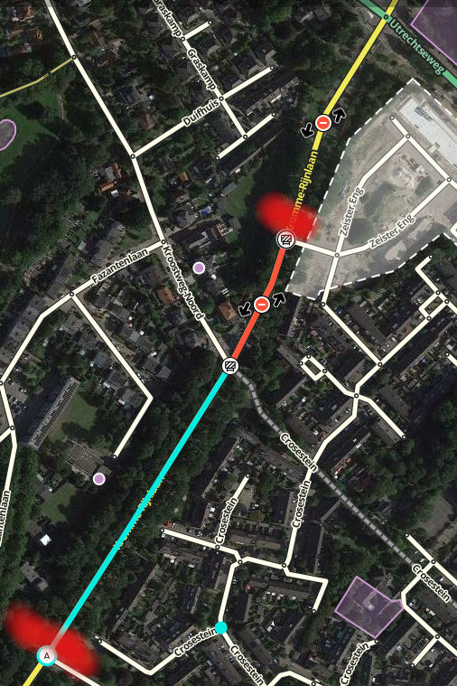Vanuit het zuiden start de afsluiting direct na de kruising Kromme-Rijnlaan en Griffensteijnselaan. De A linksonder. Het kruispunt is dus open.