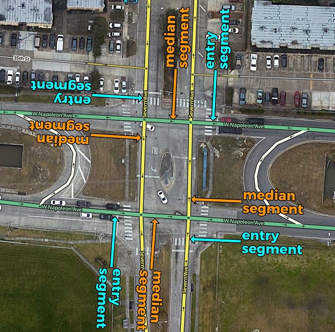 - On the median segment, include the total number of lanes which actually exist in the median. The number of lanes on the median segment should equal the number of lanes that can continue straight from the entry segment.