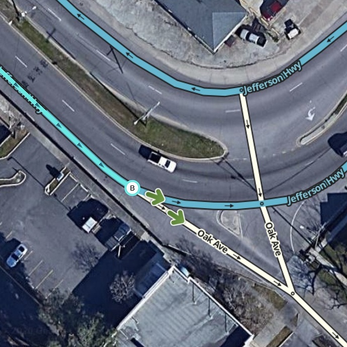 However, these situations occur in other places as well. For example, in situations where a main road veers off in one direction, and a side road continues straight ahead, the Waze selected arrows will sometimes give straight-ahead arrows to the continuation of the main road, and a “slight turn” arrow to the straight-ahead side road. This does not make sense from a driver’s perspective. In such cases, use lane angle overrides to achieve the desired result.
