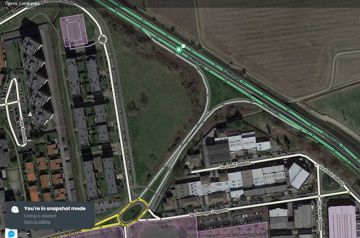 Per una corretta gestione del routing è importante che il segmento termini un poco prima della fine reale della strada: Waze infatti considera percorsa la strada solamente se siamo usciti dalla giunzione. Una buona regola è posizionare il nodo terminale ad una distanza dalla fine della strada pari a quella presente lateralmente fino al marciapiede.