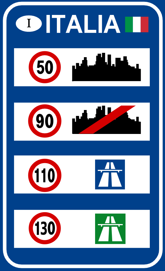 Segnale posto nei pressi di una frontiera (in ingresso nel nostro paese) che indica i limiti di velocità generici validi per le autovetture sul territorio italiano. Se posto in autostrada sarà a sfondo verde.