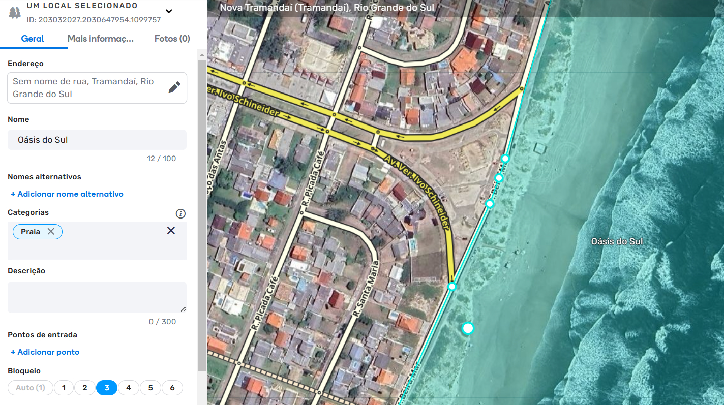 Nota: O endereço da praia deve conter apenas o município e o estado onde ela se encontra. Por exemplo: