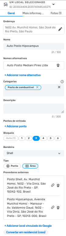 Nota: Para estabelecimentos dentro do posto, como lojas de conveniência, borracharia, e outros serviços, é valido adicionar Locais do tipo Ponto, desde que estejam dentro da area do Posto.