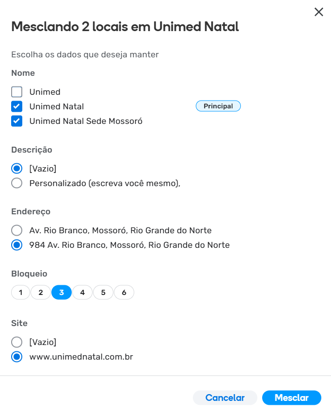 Nesta tela devemos selecionar todas as informações que serão mantidas no novo Local mesclado.
