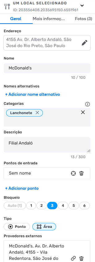 Nesta aba é possível incluir toda a informação básica de um local: Endereço, Nome, Nomes alternativos, Categoria, Descrição, Pontos de entrada, Bandeira (em caso de Posto de combustivel), Nivel de bloqueio, Tipo de local, Provedores Externos (link vinculado ao Google Maps) e Converter em residencial (Casa).