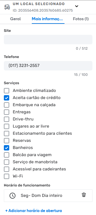 Há também campos adicionais na aba Mais informações, onde é possível adicionar telefone, serviços disponíveis, horário de funcionamento e outros detalhes.